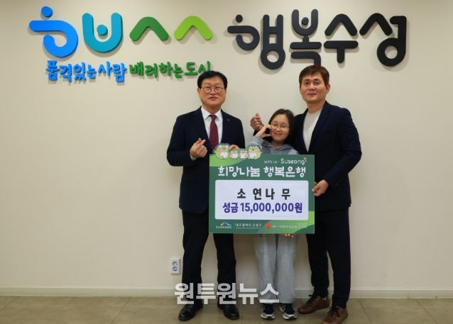 수성구청은 기탁받은 성금을 ‘희망수성 천사계좌’에 적립해 관내 취약계층을 위한 복지사업에 사용할 계획이다.