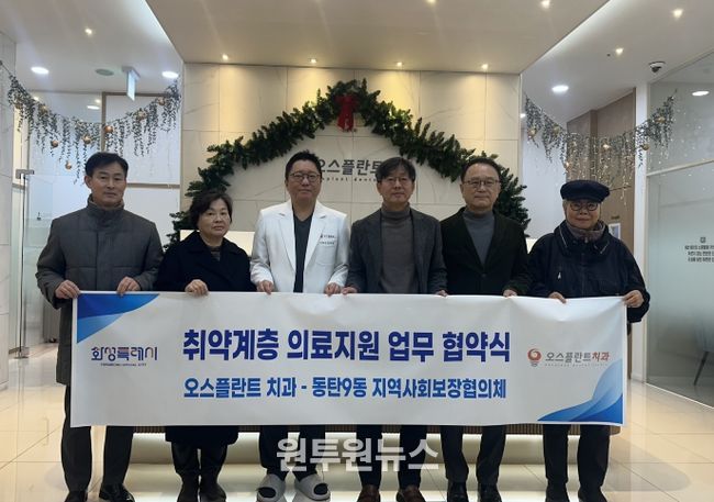 이날 협약식은 오스플란트치과에서 진행됐으며, 홍정의 동탄9동장, 이원대 동탄9동 지역사회보장협의체 부위원장, 김준형 오스플란트치과 원장 및 의료진, 협의체 위원들이 참석해 지역사회 의료복지 강화를 위한 상호 협력을 약속했다.