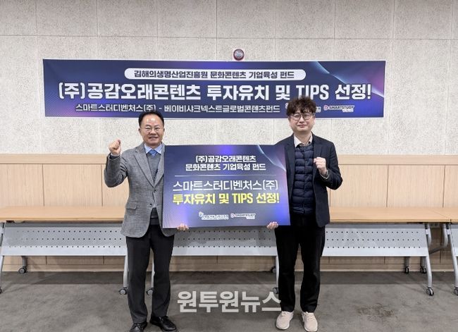 (원투원뉴스) 김해시와 김해의생명·산업진흥원은 지역 콘텐츠 기업 ㈜공감오래콘텐츠(대표 윤민형)가 글로벌 콘텐츠 IP전문 투자사인 스마트스터디벤처스(대표 이현송)로부터 투자유치에 성공하고, 중소벤처기업부 팁스(TIPS) 프로그램에 연이어 선정되는 성과를 거뒀다고 30일 밝혔다.