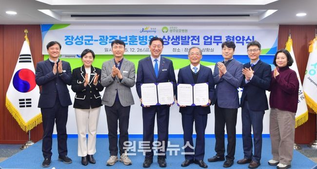 (원투원뉴스) 장성군이 지난 26일 광주보훈병원과 군민 건강 증진 및 지역 발전을 위한 업무협약을 맺었다. 김한종 장성군수, 이삼용 광주보훈병원 원장 등 관계자 10여 명이 함께했다.