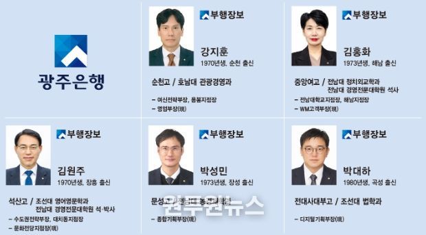 (원투원뉴스) 광주은행은 30일, 본부 조직개편과 함께 부행장보 5명(강지훈, 김홍화, 김원주, 박성민, 박대하)을 신규 선임하는 임원 인사를 단행했다고 밝혔다.