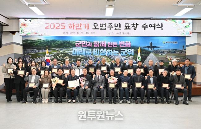 (원투원뉴스) 군위군은 30일 오전 10시 군청 대회의실에서 수상자와 가족, 부서장 등 50여 명이 참석한 가운데 2025년도 하반기 모범 주민에 대한 표창 수여식을 개최했다.