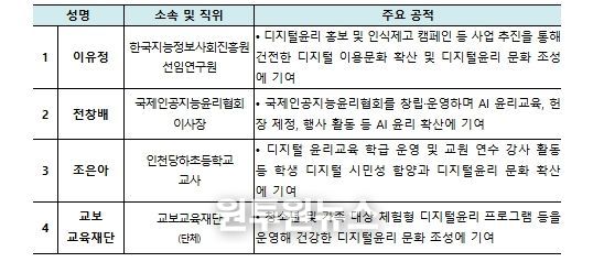‘디지털윤리 문화조성 유공’ 표창에는 디지털윤리 교육 및 인식 제고에 기여한 공로로 이유정 한국지능정보원 선임과 전창배 국제인공지능윤리협회 이사장, 조은아 인천당하초등학교 교사, 교보교육재단(단체)이 선정됐다.