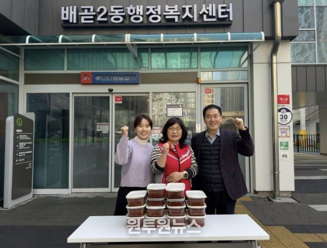 (원투원뉴스) 시민봉사단체인 ‘넝쿨봉사단’은 지난 12월 29일, 연말을 맞아 배곧2동의 어려운 이웃을 위해 무장아찌 무침 14세트를 전달하며 따뜻한 나눔을 실천했다.