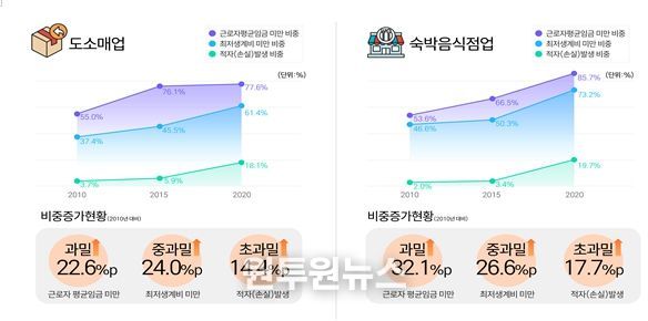 핵심 수치로는 2020년 기준 도소매업의 평균 영업이익은 2,520만원으로 근로자 평균임금 미만 사업체 77.6%, 최저생계비 미만 61.4%, 손실 발생 18.1%로 나타났으며, 숙박음식점업의 평균 영업이익은 1,000만원으로 근로자 평균임금 미만 사업체 85.7%, 최저생계비 미만 73.2%, 손실 발생 19.7%로 나타나 도소매업보다 더 취약한 양상을 보였다.