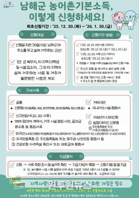 (원투원뉴스) 남해군은 ‘농어촌 기본소득 시범사업’ 신청 접수를 오는 12월 30일부터 2026년 1월 30일까지 실시한다고 밝혔다.
