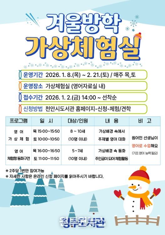 사전 신청은 영어 가상체험실은 내년 1월 2일부터, 잉글리시 스토리텔링은 1월 6일부터 가능하며, 자세한 내용은 천안시도서관 누리집에서 확인할 수 있다.