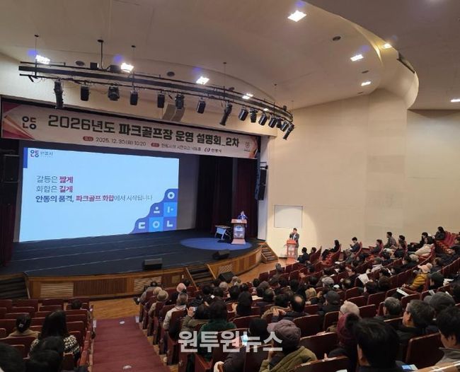 (원투원뉴스) 안동시는 파크골프장 직영 운영과 관련한 시민 의견을 수렴하고 향후 운영 방향을 공유하기 위해, 지난 12월 22일에 이어 12월 30일 ‘2026년 안동시 파크골프장 2차 운영 설명회’를 안동시민회관 낙동홀에서 개최했다.