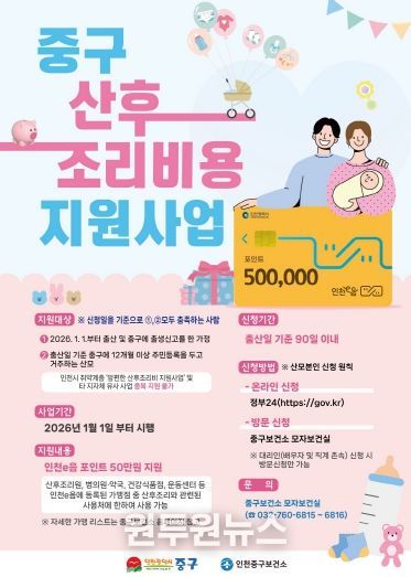 (원투원뉴스) 인천시 중구는 출산 가정의 경제적 부담을 덜어주기 위해 새해인 오는 2026년 1월 1일부터 ‘중구 산후조리비 지원 사업’을 본격적으로 시작한다고 밝혔다.