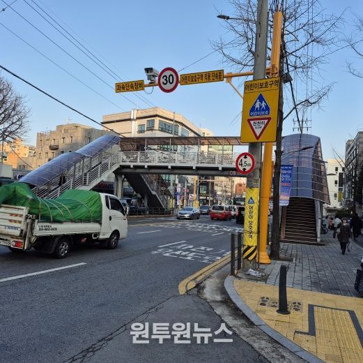 (원투원뉴스) 비가 오면 계단이 미끄럽고, 한여름엔 햇볕이 그대로 내리쬐던 배봉초 앞 보도육교가 ‘지붕 있는 통학로’로 바뀌었다. 동대문구가 학생들의 등하굣길 불편을 줄이기 위해 보도육교에 캐노피 설치를 마무리하면서다.