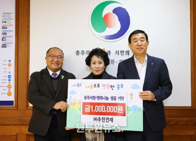 (원투원뉴스) 충주시는 지역기업 우진건재가 시청을 방문해 어려운 이웃을 위한 ‘충주사랑행복나눔’ 기금 100만 원을 기탁했다고 2일 밝혔다.
