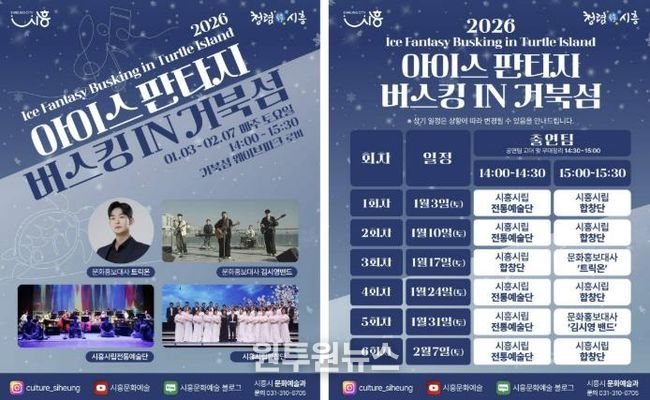 (원투원뉴스) 시흥시는 지난 연말에 진행된 ‘2025 시흥 사운드 오브 윈터’의 열기를 잇는 후속 문화예술 프로그램으로, 겨울철 거북섬을 찾는 시민과 관광객에게 풍성한 즐길 거리를 제공하고자 ‘2026 아이스 판타지 버스킹 인 거북섬’을 운영한다.