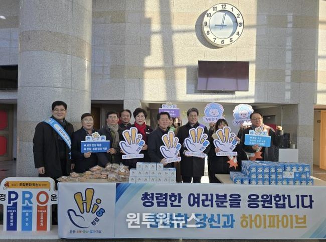 또한 시무식에 앞서 문화예술회관 대공연장 앞에서는 청렴 Hi-5 캠페인이 진행됐다. 김돈곤 군수와 부서장들은 시무식에 입장하는 직원들과 하이파이브(High five)를 나누며 소통과 청렴의 뜻을 함께하고, 청렴 응원 물품과 ‘청렴 응원 빵’을 전달하며 직원들을 격려했다.