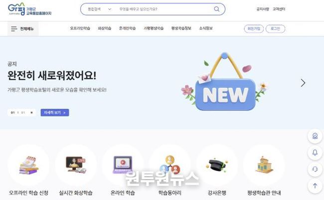 (원투원뉴스) 가평군이 올해부터 군민 모두가 함께 배우고 성장하는 평생학습도시 조성을 목표로 평생학습 홈페이지를 전면 개편해 새롭게 운영한다. 온라인 기반 학습 환경을 강화하고 교육 참여 기회를 확대하기 위한 조치다.