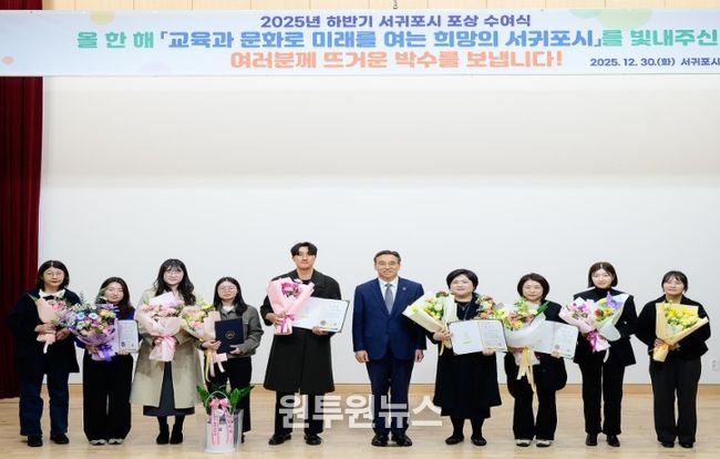 (원투원뉴스) 서귀포시는 30일 서귀포시청 제1청사 별관 문화강좌실에서 포상수여자 및 가족, 동료 등 200여 명이 참석한 가운데 ‘2025년 하반기 서귀포시 포상수여식’을 개최했다.