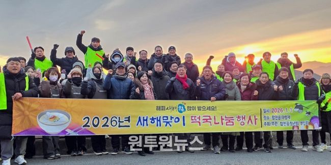 (원투원뉴스) 합천읍청년회는 2026년 병오년 새해를 맞아 1월 1일 새벽 6시부터 합천읍 마령재 일원에서 ‘2026 해맞이 떡국 나눔 행사’를 개최했다.