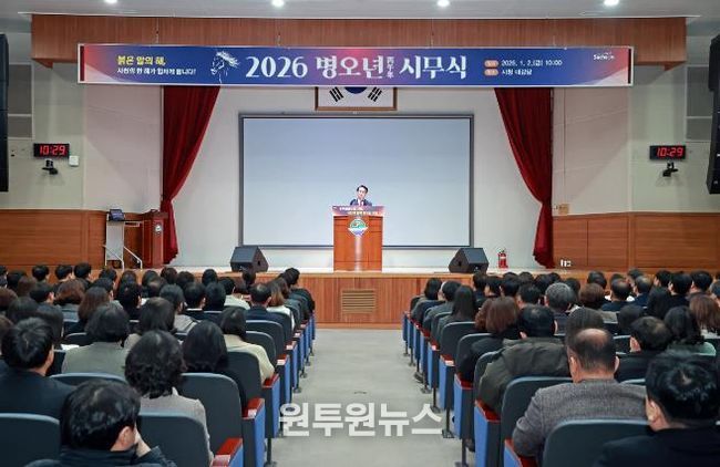 (원투원뉴스) 사천시는 2일 오전 10시 시청 대강당에서 박동식 사천시장을 비롯해 김제홍 부시장, 국·소장 및 전 직원이 참석한 가운데 2026년 병오년 시무식을 개최했다.