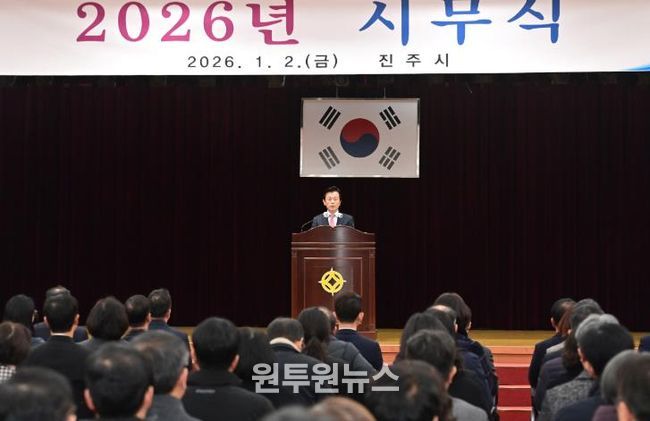 (원투원뉴스) 진주시는 2일 시청 시민홀에서 ‘2026년 시무식’을 갖고, 2026년에는 더 높이 도약할 것을 다짐하면서 새해 업무를 본격적으로 시작했다.