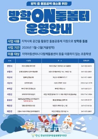 (원투원뉴스) 충남사회서비스원은 1월 2일부터 겨울방학 기간 동안 돌봄이 필요한 아동을 위해 방학ON돌봄터를 발굴하여 운영을 지원한다.