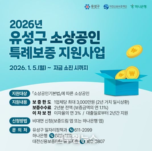 (원투원뉴스) 대전 유성구는 소상공인과 창업 기업의 금융 부담 완화를 위해 ‘2026년도 소상공인·창업 특례 보증 지원 사업’을 운영한다.