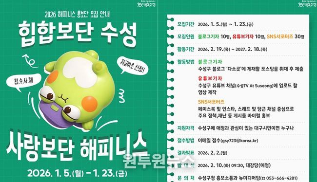 (원투원뉴스) 대구 수성구는 주민이 직접 참여하는 소통 중심의 구정 홍보를 확대하기 위해‘2026년 해피니스 홍보단’을 이달 5일부터 23일까지 모집한다.