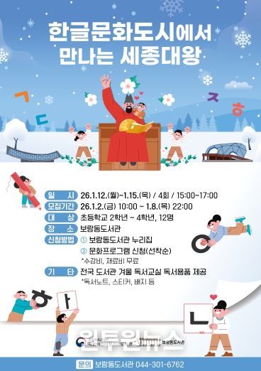 (원투원뉴스) 세종시립도서관이 오는 12일부터 16일까지 보람동도서관에서 초등학교 2∼4학년 학생을 대상으로 ‘2026년 전국 도서관 겨울 독서교실’을 운영한다.