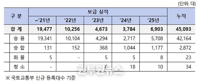 지난해(2025년) 수소차는 전년(2024년)에 비해 182% 늘어난 6,903대가 보급됐다. 특히 수소 승용차는 7년 만에 신차가 출시됨에 따라 전년도 대비 210%가 증가한 5,708대를 기록했다.