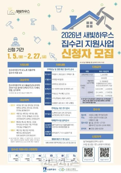 (원투원뉴스) 수원특례시가 5일부터 2월 27일까지 노후 저층주택 집수리 지원사업 ‘새빛하우스’ 신청을 받는다.