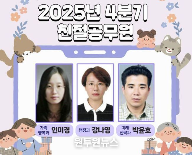 (원투원뉴스) 충북 괴산군은 2025년 4분기 친절공무원으로 안미경 주무관(가족행복과), 강나영 팀장(행정과), 박윤호 팀장(칠성면)을 선정했다고 5일 밝혔다.