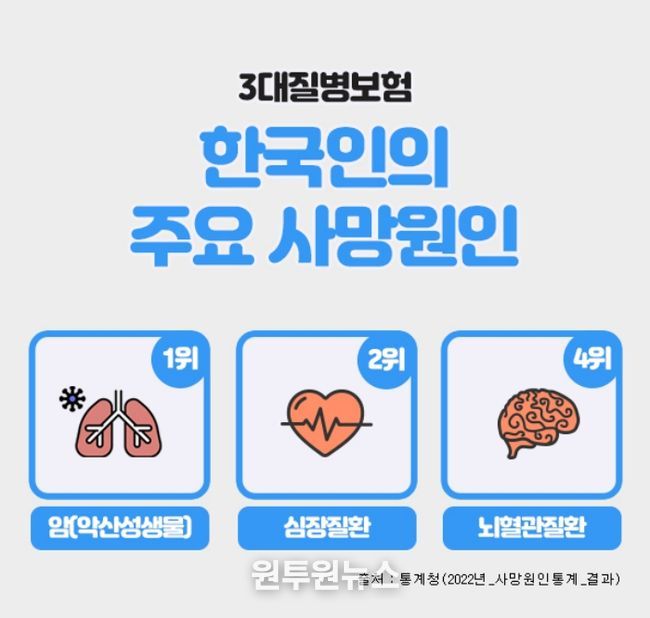 (원투원뉴스) 3대질병으로 일컬어지는 암, 뇌혈관질환, 심혈관질환은 한국인의 주요 사망원인에서 상위를 차지하고 있으며, 이에 대한 진단비를 집중적으로 보장해 주는 보험상품을 3대질병진단비 보험이라 할 수 있다.