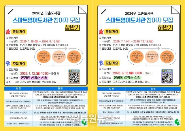 (원투원뉴스) 김포시 고촌도서관이 2026년 1월 19일부터 12월 18일까지 ‘2026년 스마트영어도서관’을 운영한다.