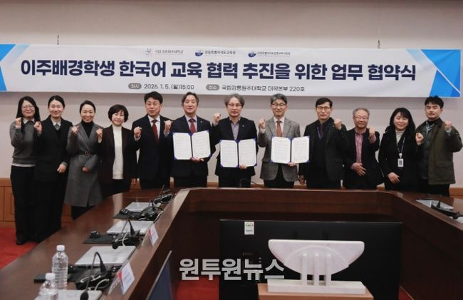 (원투원뉴스) 강원특별자치도교육청은 1월 5일 국립강릉원주대학교에서 강릉교육지원청, 국립강릉원주대학교와 함께 이주배경학생의 한국어교육 내실화와 안정적인 공교육 진입 지원을 위한 업무협약을 체결했다.