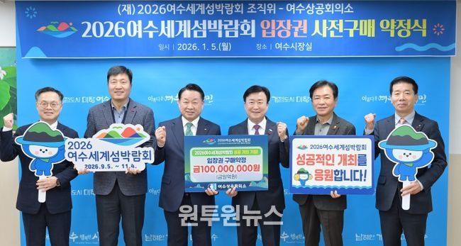 (원투원뉴스) (재)2026여수세계섬박람회 조직위원회는 지난 5일 여수상공회의소와 1억원 규모의 입장권 구매약정을 체결했다.