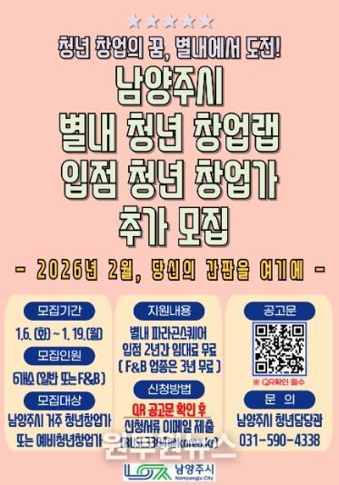 (원투원뉴스) 남양주시는 6일부터 청년 창업가들을 위한 ‘남양주시 별내 청년 창업랩’입점자를 추가 모집한다고 밝혔다.