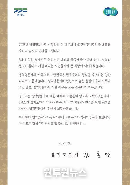 김동연 경기도지사는 서한문을 통해 “병역명문가의 애국으로 대한민국은 민주주의와 평화를 수호하는 강한 나라로 거듭났다”면서 “경기도는 병역명문가에 대한 예우에 소홀함이 없도록 노력하겠으며, 헌신에 보답하겠다”고 감사와 존경의 뜻을 표현했다.