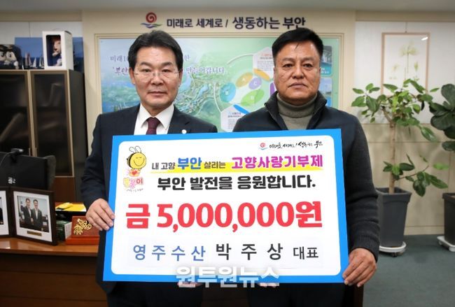 (원투원뉴스) 부안군은 최근 진서면에서 수산업체 영주수산을 운영하고 있는 박주상 대표가 고향사랑기부금 500만원을 기탁했다고 밝혔다.