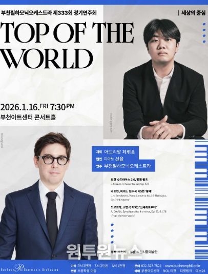 (원투원뉴스) 부천필하모닉오케스트라가 오는 1월 16일 오후 7시 30분 부천아트센터 콘서트홀에서 제333회 정기연주회 신년음악회 ‘Top of the World’를 개최한다. 이번 공연은 새로운 한 해의 출발점에서 ‘정상’과 ‘도약’을 주제로 슈트라우스 2세의 〈황제 왈츠〉, 베토벤 〈피아노 협주곡 제5번 ‘황제’〉, 드보르작 〈교향곡 제9번 ‘신세계로부터’〉를 선보이며 새해의 기운을 밝힌다. 무대에는 상임지휘자 아드리앙 페뤼숑과 부천필, 협연자로는 피아니스트 선율이 함께한다.