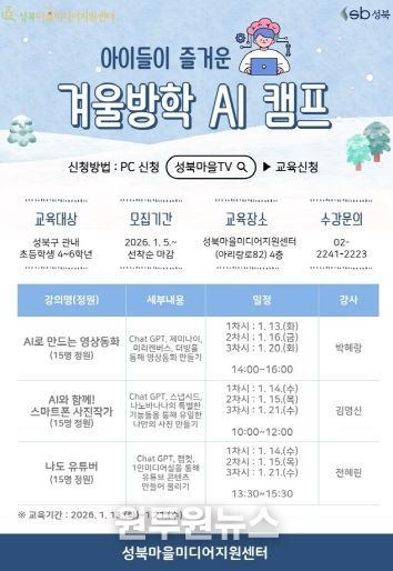 (원투원뉴스) 서울 성북구 성북마을미 디어지원센터가 오는 13일부터 21일까지 미디어 체험 프로그램인 ‘겨울방학 AI 캠프’를 운영한다.