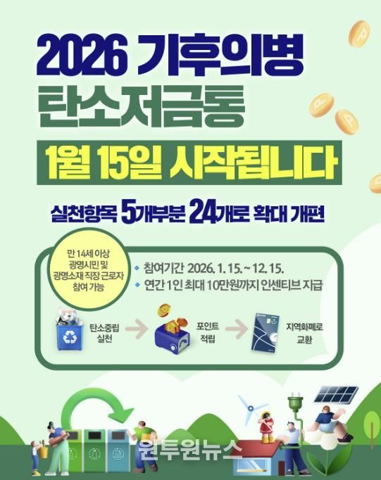 (원투원뉴스) 광명시가 오는 15일부터 2026년 기후의병 탄소저금통 사업을 확대 개편해 운영한다고 8일 밝혔다.