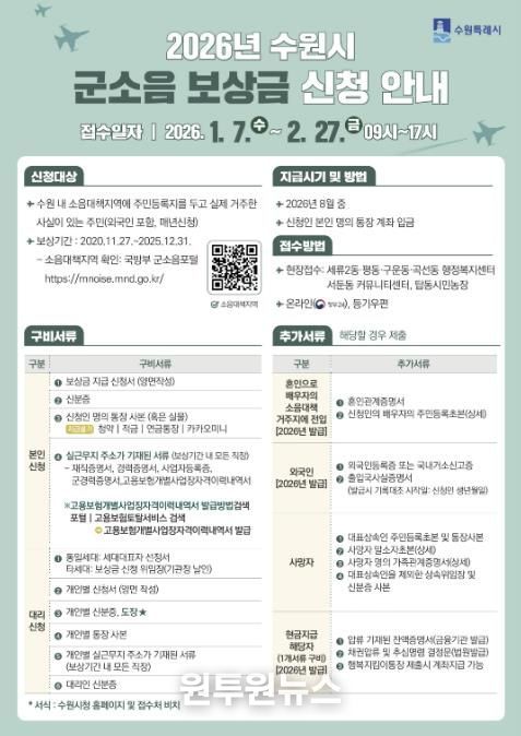 (원투원뉴스) 수원특례시는 2월 27일까지 ‘2026년 군소음 피해보상금’ 신청을 받는다.