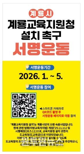 계룡시는 본 서명 운동이 지역 교육의 미래를 바꿀 중요한 시작점이 될 것으로 기대하며, 학부모와 시민들이 한마음으로 협력해 교육 현장의 목소리를 적극적으로 담아내는 계기가 되길 기대하고 있다.