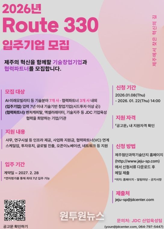 (원투원뉴스) 제주국제자유도시개발센터가 제주혁신성장센터의 차세대 유니콘 창업기업을 발굴·육성하기 위한 2026년 Route330 신규 입주기업 및 협력파트너(AC, VC)를 공개모집한다고 밝혔다.