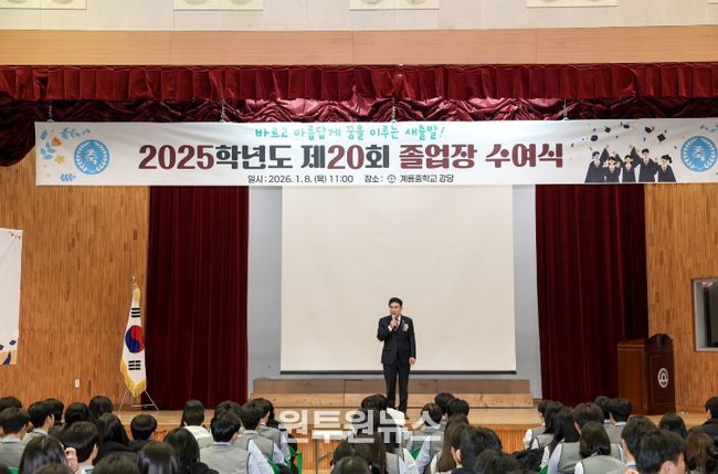 (원투원뉴스) 충남 계룡시는 지난 8일 계룡중학교(교장 이기수)에서 개최하는 제20회 졸업식에 참석하여 졸업생들의 새로운 출발을 축하했다.