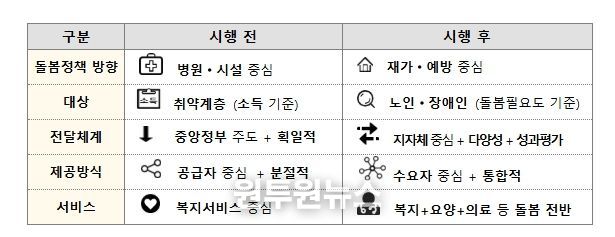 우선 돌봄의 중심이 병원·시설에서 재가·예방으로 옮겨져, 입원·입소 경계선상의 노인·장애인 등이 살던 곳에서 필요한 서비스를 지원받을 수 있게 된다. 소득 기준 중심의 지원에서 벗어나, 노인·장애인의 돌봄 필요도를 기준으로 서비스를 연계해 제공함으로써 사각지대를 줄인다.
