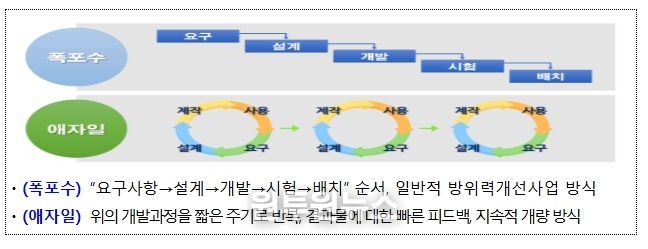 애자일(Agile) 개발은 짧은 주기로 소프트웨어를 반복 개발·배포하고 전력화 이후에도 성능을 지속 고도화할 수 있는 방식으로, 미국 국방부와 정보통신기업에서도 널리 활용되고 있다. 기존 폭포수(Waterfall) 방식은 장기간 일괄 개발 구조로 하드웨어 중심 무기체계 개발에 기여해왔으나, 인공지능(AI), 무인·로봇 등 소프트웨어 중심 첨단 무기체계의 신속하고 유연한 개발을 위해 애자일 방식을 새롭게 도입하게 됐다.