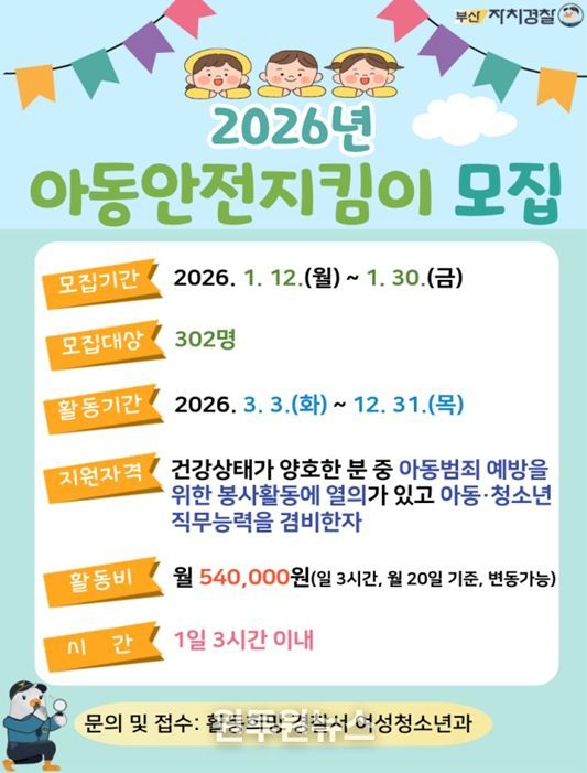 (원투원뉴스) 부산시 자치경찰위원회는 부산경찰청과 함께 오는 1월 12일부터 1월 30일까지 '2026년 아동안전지킴이'를 모집한다고 밝혔다.