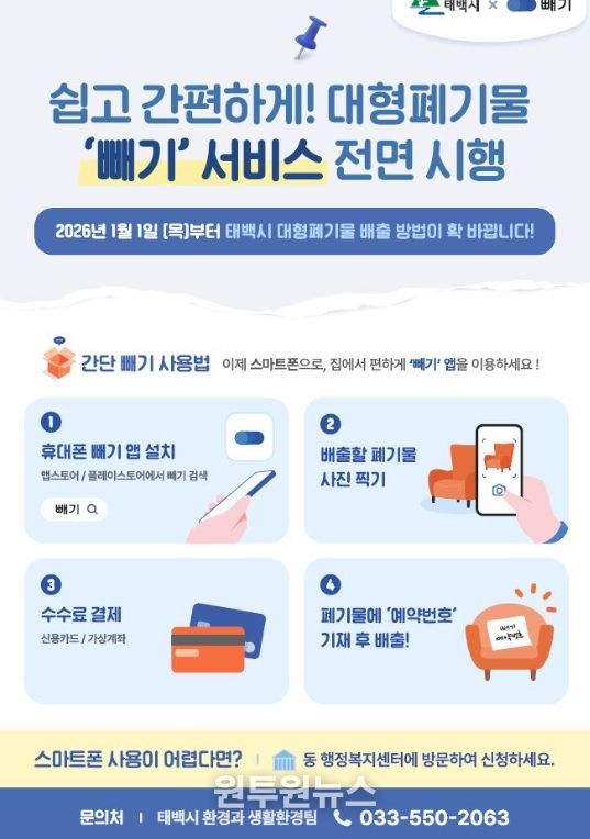 (원투원뉴스) 태백시는 2026년 1월 1일부터 대형폐기물 배출 신청부터 수수료 결제, 처리 결과 확인까지 전 과정을 스마트폰 앱 ‘빼기’를 통해 원스톱으로 처리할 수 있는 서비스를 본격 시행한다고 밝혔다.