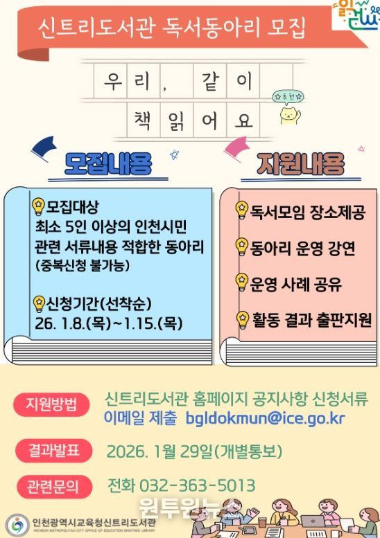 (원투원뉴스) 인천광역시교육청신트리도서관은 시민 주도의 자율적인 독서 활동을 지원하고 생활 속 독서문화를 확산하기 위해 '2026년 자율독서동아리 지원사업'의 동아리를 모집한다.
