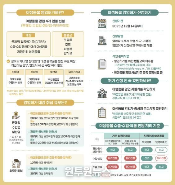 ‘야생동물 영업허가제’는 '야생생물 보호 및 관리에 관한 법률' 개정(2022. 12. 13.)에 따라 3년 간의 유예기간을 거쳐 지난 2025년 12월 14일부터 시행됐다. 이에 따라 살아있거나 알 상태의 야생동물을 일정 규모 이상 취급하는 영업자는 반드시 관할 지자체의 허가를 받아야 한다.