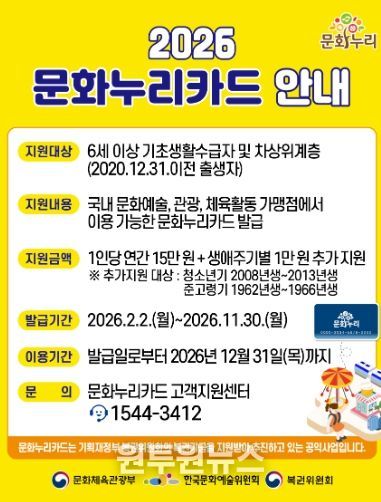 (원투원뉴스) 정부 정책에 따라 2026년부터 통합문화이용권(문화누리카드)과 청년문화예술패스 제도가 개편된다. 이에 따라 양주시는 개편 기준에 맞춰 지역대상자를 대상으로 해당 사업을 확대 시행한다고 밝혔다.